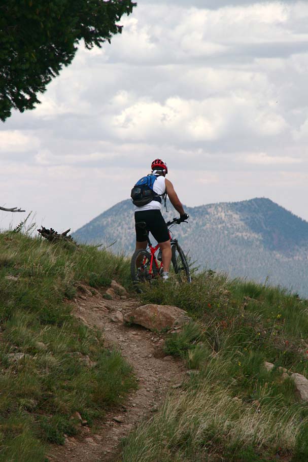 images/Trails/AZ06/AZ06-Flagstaff-1AUG06-24.jpgSoon the trail gets extremely picturesque as it chisels its way slightly downhill along an extremely steep mountainside with expansive views of Little Elden Mountain directly ahead and a large valley below.  The Sunset trail soon splits off to the left.  Do not take the Heart trail that splits off to the right, it will get you off the mountain but on the wrong side.   For the next .8 miles the Sunset gets really fast with some large round rock technical sections thrown in the mix that offer plenty of "Pick a line, any line" kinds of moments through the rocks.