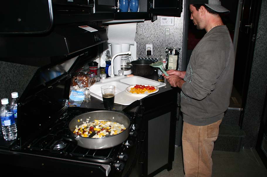 images/Trails/AZ06/AZ06-RVing-30JUL06-02.jpg After the ride we checked out one of the local bikes shops for mostly S&Gs before heading back for an afternoon of lounging and shooting the breeze.  The weather that evening was absolutely awesome so Cris setup the RVQ (A new term for me - A BBQ Grill that hooks to the side of the RV) and pulled out some truly massive steaks that Heath grilled up.  Later on, over the course of mowing down the steaks, we started doing some time, distance, and speed word problems and soon had devised a plan for tomorrow's activities. images/Trails/AZ06/AZ06-RVing-1AUG06-06.jpg