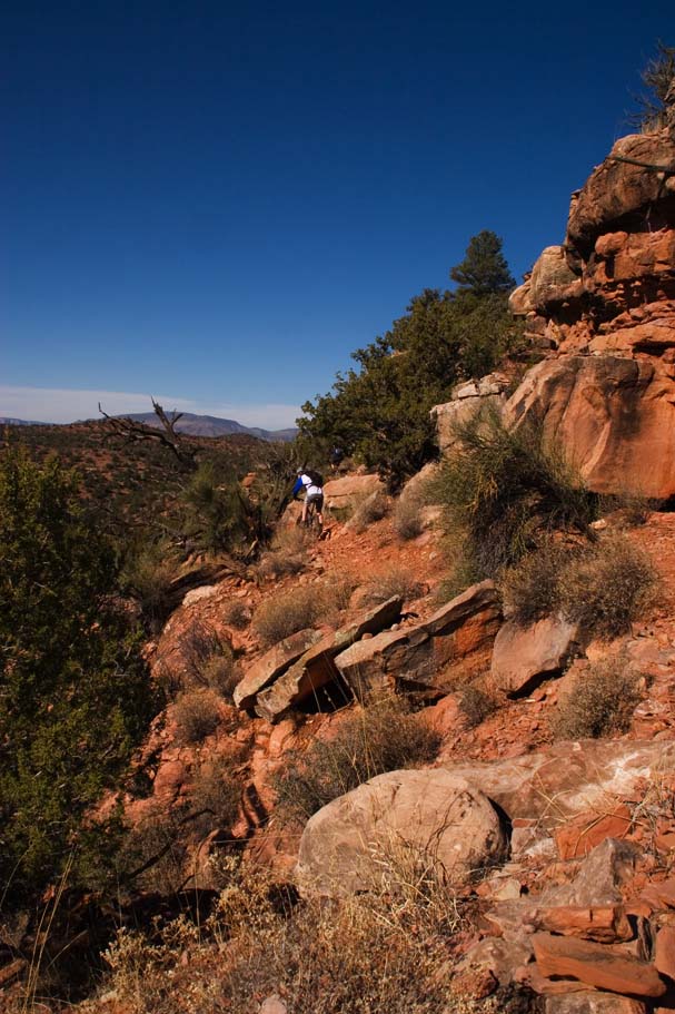 Everybody got off to a slow and leisurely start today that included breakfast at the local bakery which was mighty tasty. Now while the SoCal contingent only had one day of riding on our legs, the Colorado folks were going on something like eight straight days of substantial riding and most were looking for something that was not quite epic in nature. Joe, a Flagstaff local (among many other things), came down and showed us around on some nice loops that included some technical chunky stuff that is not yet in the books out near the Dry Creek trails. The trails we were on had some picturesque exposure while being narrow with tight turns that were often times off camber. The chunk factor was high enough that if you did dab, getting back into a rhythm again was tough. I was asked not name these trail so please don't ask. Hook up with some locals and there is a descent chance you'll end up on this trail. UPDATE : Most of those unamed trails have been legalized since 2007. I don't remember all of the names but Ledge-N-Airy was one of them.