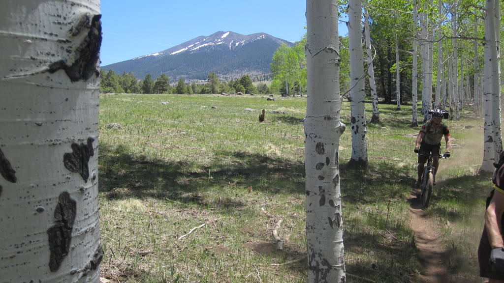 We eventually worked or way out to the southwest corner of the Hart Prairie. To say this was pretty would be huge understatement. The grasslands, aspens, the San Francisco Peaks in the distance made for some mighty might nice views. The trail soon brought us out to Forest Road 151 where we turned north and did some casual dirt roading for a a handful of miles until we hit Forest Road 418 where we turned east (right) and did some flatlanding and mild climbing for a couple of miles until we picked up the the Arizona Trail when it crossed the road. We turned right (uphill) and were back onto sweet single track