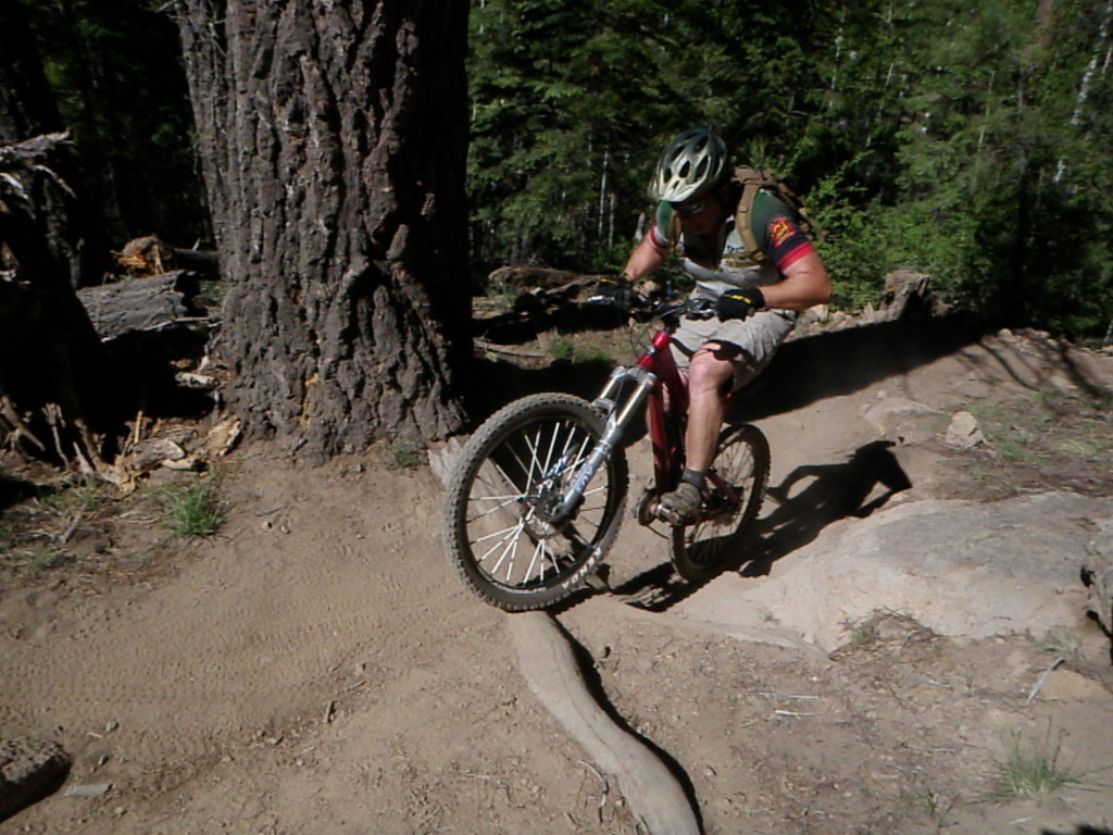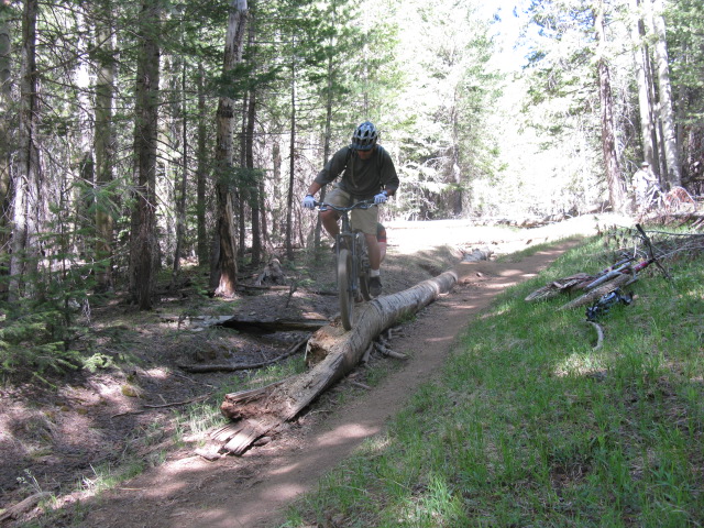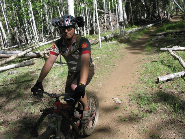 By 2PM we had camp setup and were ready to go catch a ride so Bill, Jeff and I headed out for a loop. We decided to climb an old double track simply known as "Climb 3". It is not on a lot of the maps, but it is in between Little Gnarly and the Sunset Trail. We were not long into the climbing when we started passing through some Aspens. I absolutely love these trees. I think they are some of the prettiest trees I have ever seen and I love taking pictures with them in frame. We found a fallen aspen that made for an interesting log ride. Aspens and a log ride, that is a combination worth busting the camera out for.