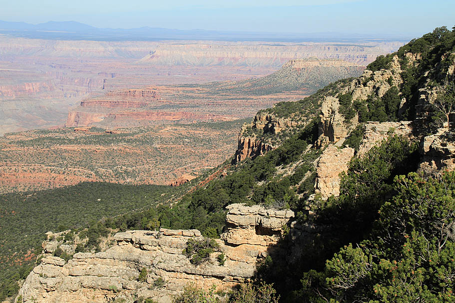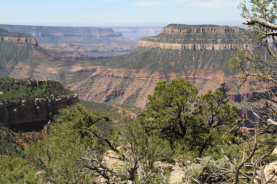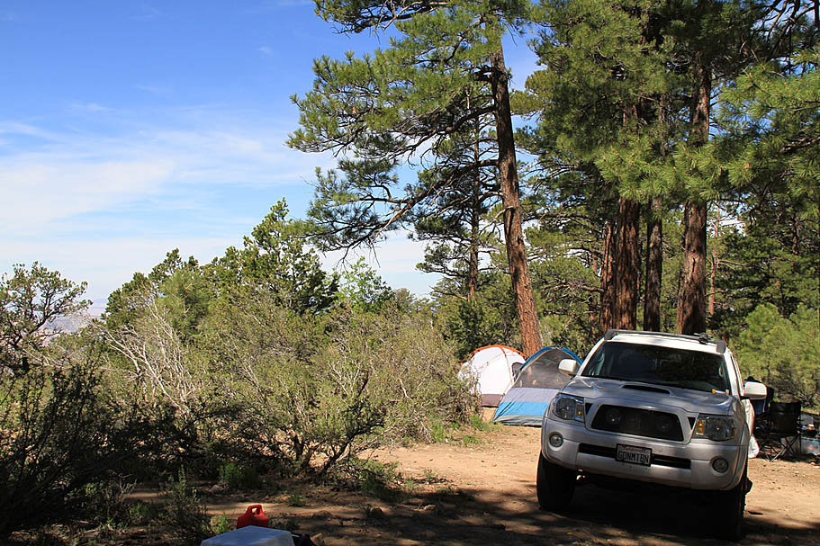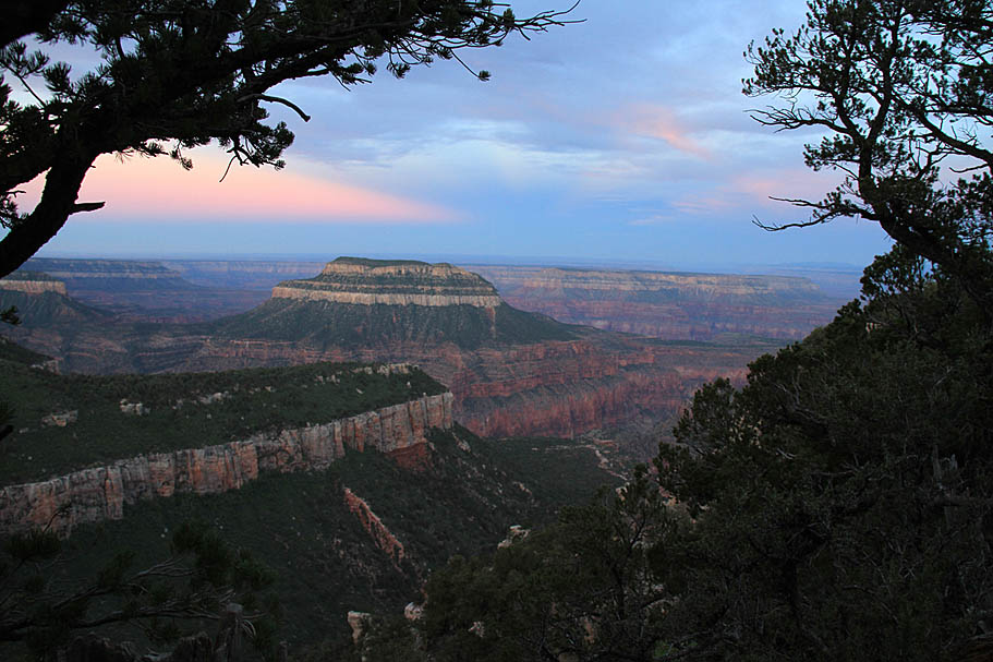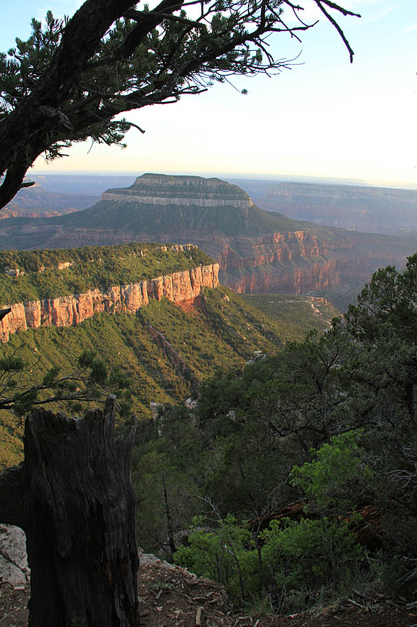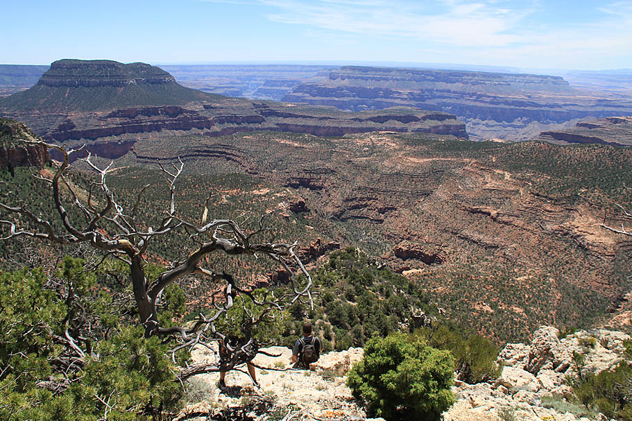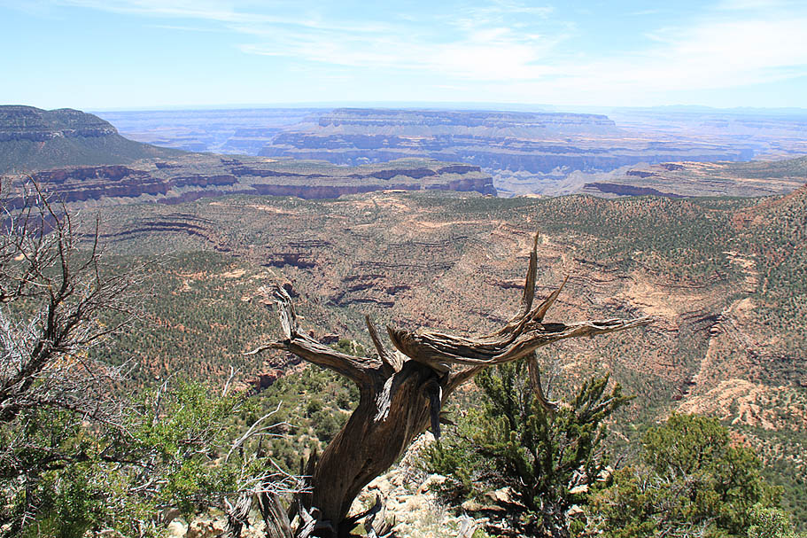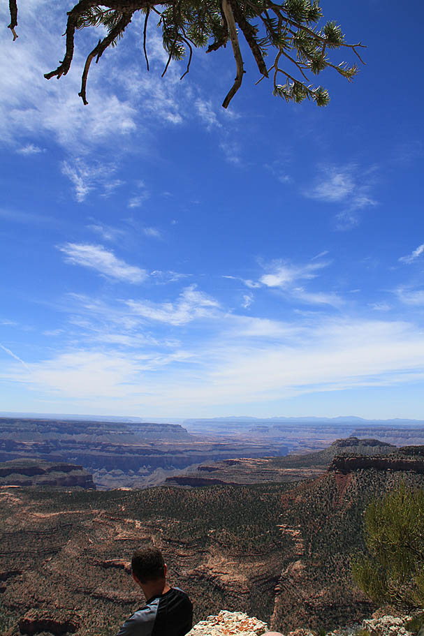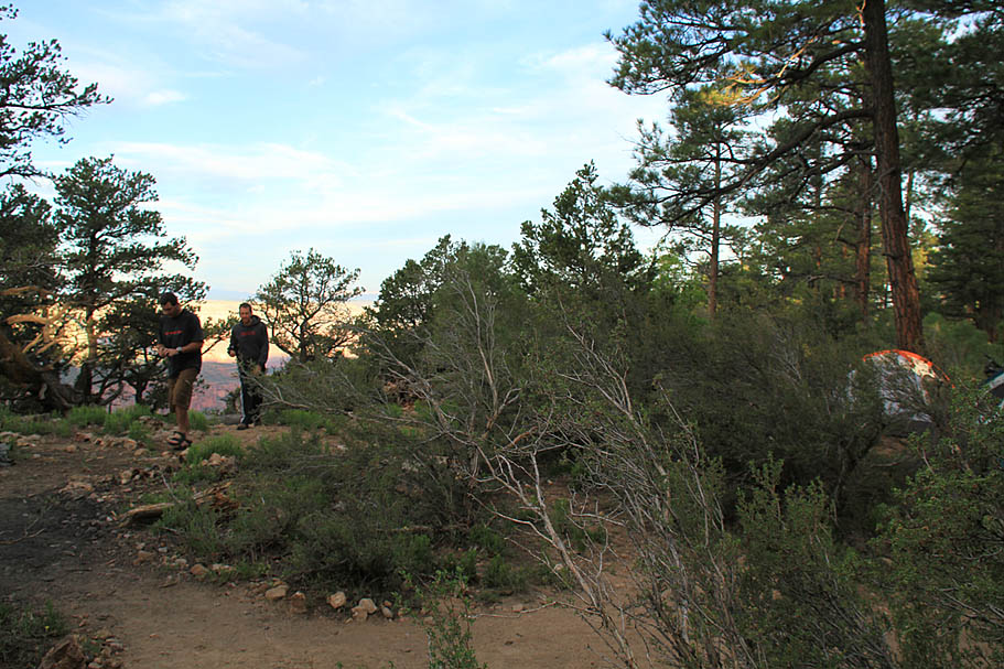 Sleeping that night was simply fantastic. There were lots of wind currents whooshing up from the canyon but because of our proximity to the edge we were in a natural wind shadow that kept our tents from getting blown around much while the trees got their top tussled quite nicely. We had the benefit of the sound of the wind without getting pushed around by it. Adding to this was a perfectly clear sky with no moon. While there was a slight glow of light pollution on the horizon to the southwest from Las Vegas hundreds of miles away it was for the most part a completely dark place. What stretched out above my head heads was a magnificent tapestry of stars and galaxies that has only been bettered a couple times during my crossing of the Pacific Ocean during my Navy days. I felt so small and fortunate to be in such a special place as I fell off to a deep and restful sleep.