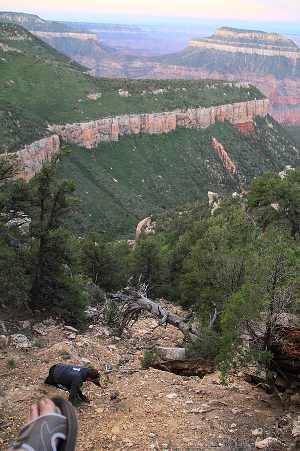 Some additional shots from the evenings and early morning timeframe from the campsite. It is amazing to see how the colors changes as the light shifts. The pictures to the left and right are from when I was hanging dangling my feet over the edge when one of my flip-flops came off. Bill asked the question doe you think someone could climb down there. I replied "someone with two shoes sure could". Bill was gracious enough to scramble down and retrieve my wayward foot gear. What a bud!