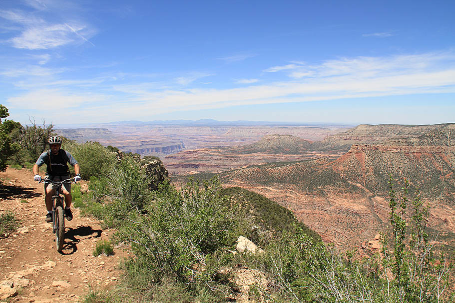 The Rainbow Rim Trail is 18 miles long and easily rideable in a day as an out-and-back if you are “on the pedals”. Personally, I think you would be quite the bonehead to do so as this ride deserves to take plenty of time to stop and smell the flowers, take in the views and generally just soak the whole place in. You can hammer on any trail, but it's not everyday you get to cruise along the rim of the Grand Canyon. After Jeff and Bill rustled up we had some breakfast then leisurely got out stuff around for an out-and-back to Parissawampitts Point. It is a tricky name to say and we found unending pleasure from seeing how many ways we could butcher the name.