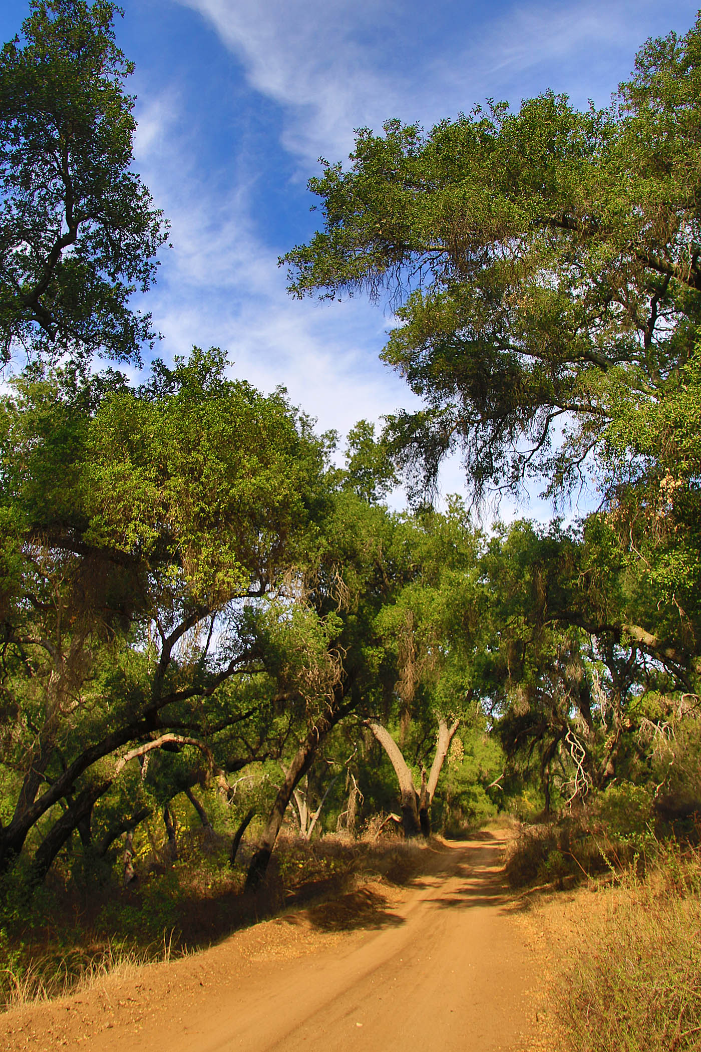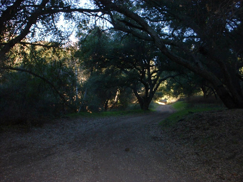 | After taking in the views I rolled downhill into a grove of trees at mile 9.3 where the trail splits in two directions. The three pictures below are of that intersection, looking left, straight, and right respectively. I do not know where the trail off to the left goes. If you do please email me. I have heard that it will eventually take you out to Pamo Valley Road near the bottom of the steep pavement climb (more on that to come) I took the trail to the right which apparently is the Santa Ysabel truck trail still. |