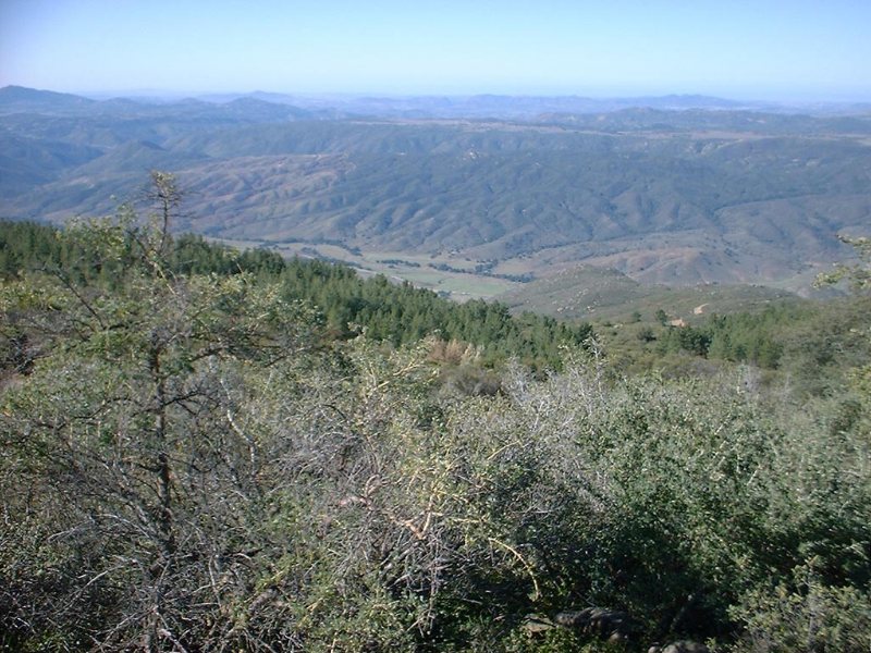 | At this point I am on the Santa Ysabel Truck Trail. For the next two miles I was climbing but there was enough interspersed downhill sections to keep things interesting and the views were really nice. This section mostly runs west. The trees in the saddle of Black Canyon road you past earlier can be seen in the center picture below |