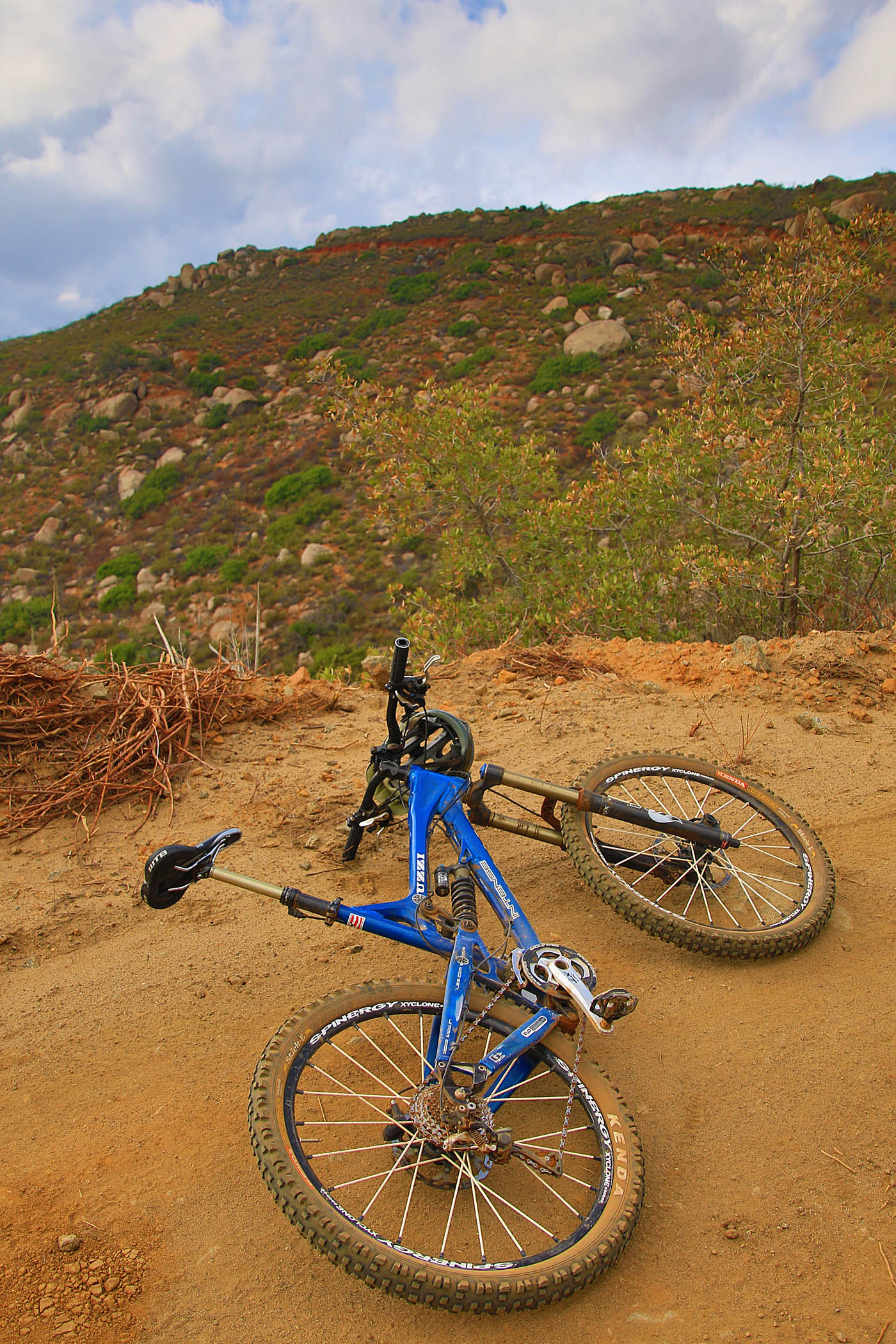| After I had my fill of the peak I hiked back down to the bike and rolled off down the trail. On the way down I did stop and take a few pictures. One thing that was interesting is that up near the top of the mountain I found a small shaded area with a hold out patch of snow from a storm a couple of weeks ago. Considering that it was in the mid-70s in February, I decided it was picture worthy. I planned on taking more pictures on the way down, but when you have a 7.5 mile down hill that sheds off over 3,000 feet it is hard too pause the adrenaline rush. Watching my speed was the name of the game on the way down. The tricky ruts seemed to pop up in turns and the wash boards really worked my hands over pretty good. |