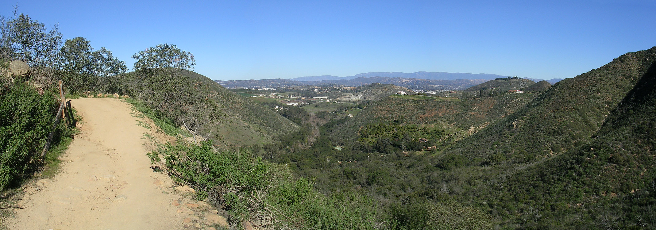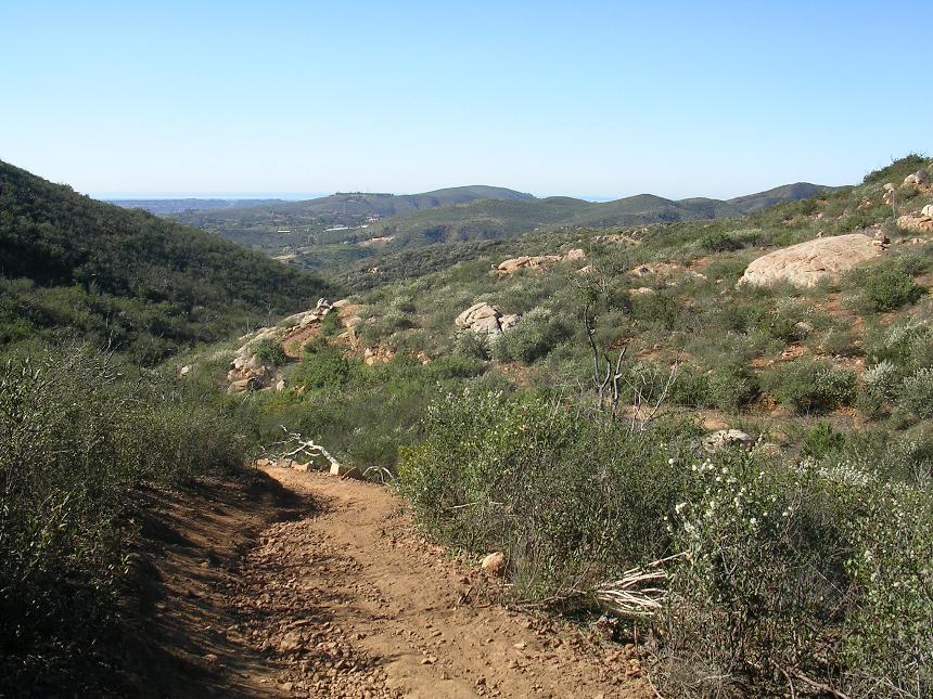 The loop trail is a lot of fun. You will most likely not notice this shortcut trail off to your right at a low spot in the trail that will take you right back up to the overlook, but don't worry about that as you are going that way anyway. The loop feeds you back onto the overlook trail heading back towards the ridge maintenance road. Retrace your way back to the large flat area via the Ridgeline Maintenance road and the Quail Trail. Continue straightish through this intersection and pickup Equine Incline trail and take the loop clockwise. There is some gruntage to be done to get up to the highpoint of this route at the junction of the Manzanita Trail. It is worth a snack break at the top to take in some views before continuing along. The descent down from here is a good chunk of technical fun. After the low spot you will have a short bit of steepish climbing to down before the trail turns towards the east and mellows out. At this point be on the lookout for the Los Ceilos Preserve trail heading off to your left. You should be right at the 10-mile mark at the junction. Take this trail and a nice bit of descending over the next mile. The trail will bring you out onto the Escondido Sewer easement dirt road. Hang a left and take it out to Via Ambiente. Hang a right and you should see the bridge, gate and parking lot you started from ahead.