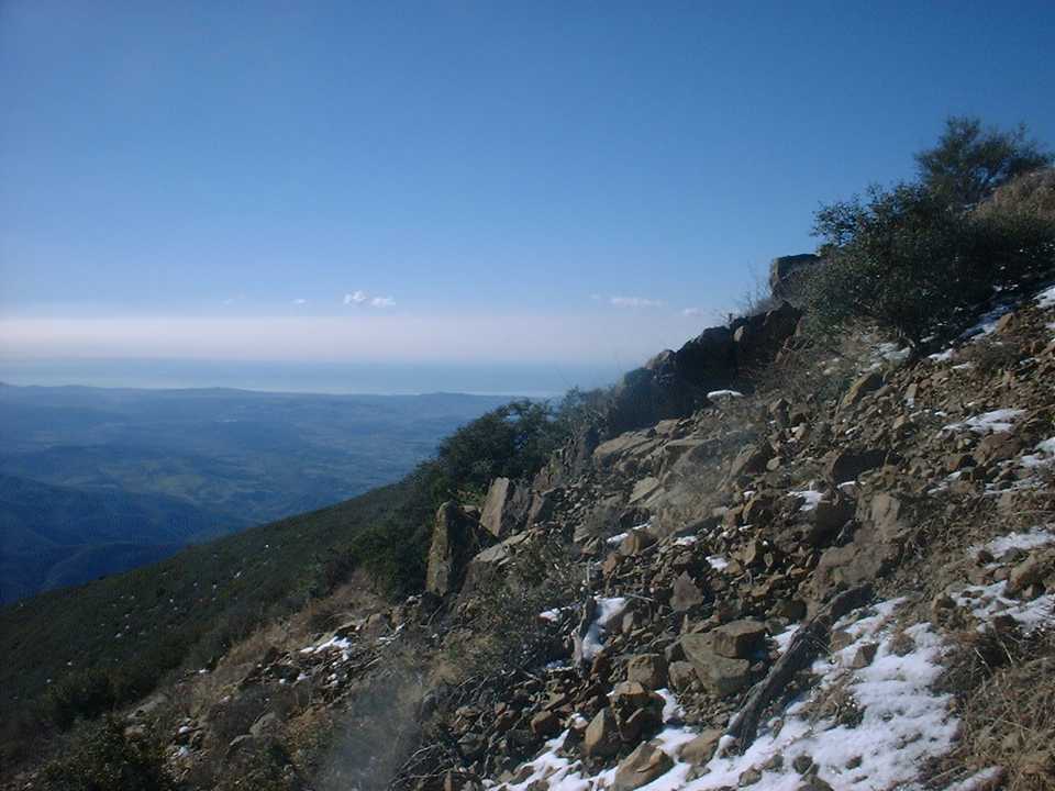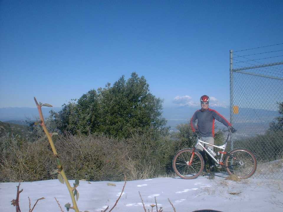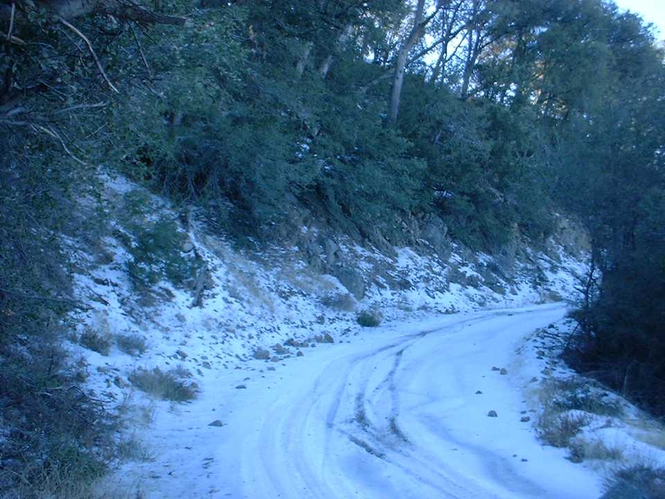 As I started the decent down Main Divide on the other side of the peak (This is the steepest part of the entire the truck trail to boot) I learned a couple of things about biking in the snow. First, SPD pedals are not so great in the snow. While walking around on the peak, the snow compressed around the cleats to make a nice ice brick which made my shoes impossible to get clipped in. I had to find a rock of just the right size to poke all the ice out. Second, biking downhill in the snow is downright tricky. I found that riding in a line (made by another vehicle) is about the worst thing you can do as there is a damn good chance it has been compressed into ice. Staying in the “new” snow provides for better steering and a little natural braking action that helps keep you under control. After about a ¼ mile of biking/sledding I was out of the snow and it was time for some fire road bombing. The truck trail was quite rocky and rutted (from 4WD types with more power than skills) which requires some good bike handling to bomb. The rocks on the trail here are the type that are best “flown” over, but with the many ruts I found myself riding slightly below the optimum speed. (Please check out this additional information on an alternate route to take on the way down from Santiago Peak to the Holy Jim Trail)