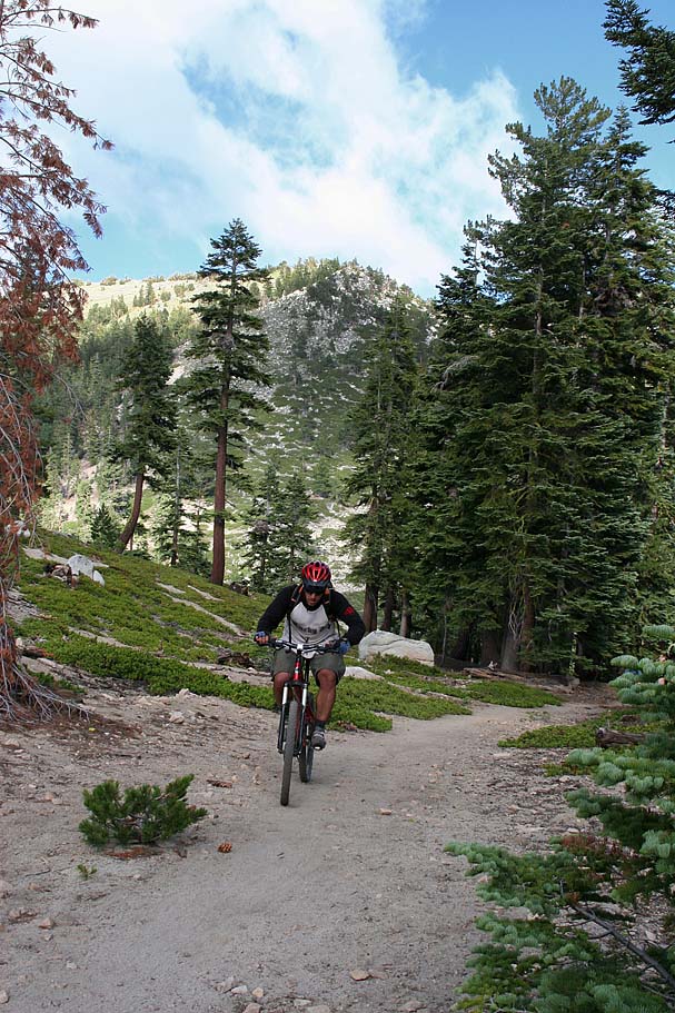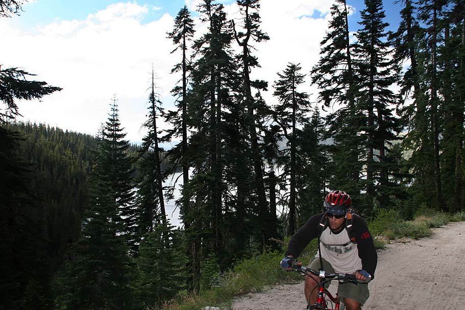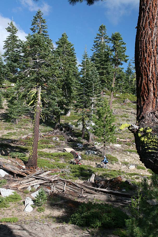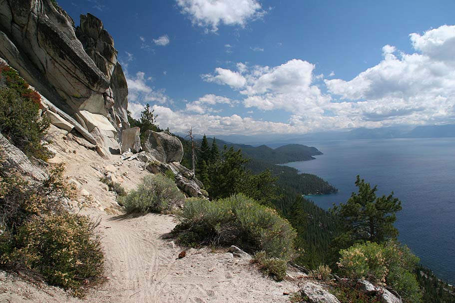 Taking this trail was simply bliss. It sees no where near the traffic of the Rim and Flume trails and is much narrower. While is does have a few incidental climbs and flat spots for the most part it is a rip fest singletrack dumping about 2,000 feet in 3.75 miles on its way down to the Chimney Beach parking lot and our waiting vehicle. The trail requires some good bike handling skills due to the sometime sandy nature of the trails here combined with the steep grade.