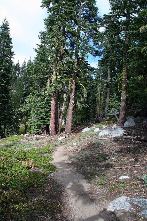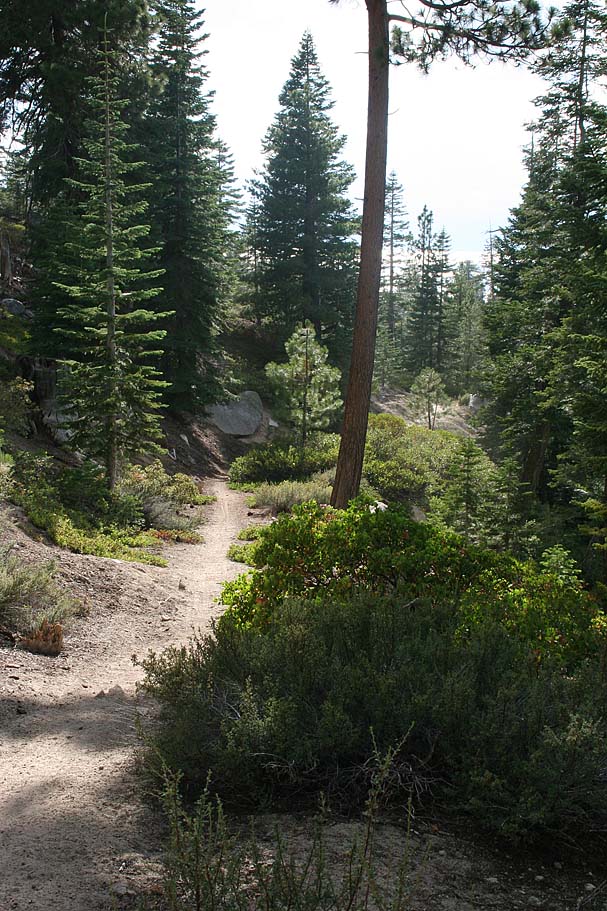 The crappy picture to the left shows the trail you want to take to get on the Chimney Beach trail. The trail is unsigned and located about 40 yards past the large map kiosk at the top of the saddle. This trail will go about 40 feet to a a 4-way intersection of singletracks. To your left and right is what I believe is the the Martlett to Spooner Lake singletrack which is off-limits to bikes.