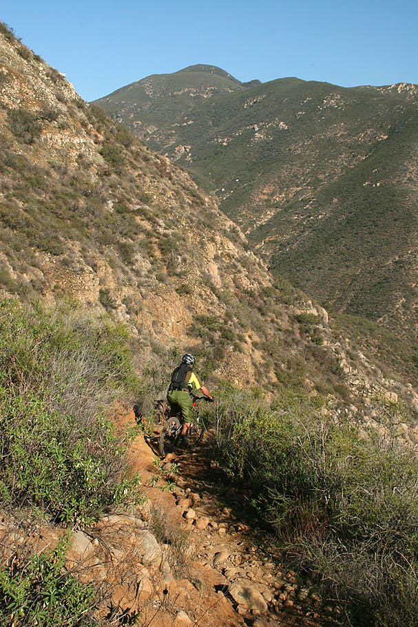 | Located near the southern end of the Santa Ana Mountains in Orange County this is a pretty remote, steep and rugged trail that runs right along the spine of an undualating ridge for about nine miles. On clear days it seems like you can see forever as the San Jacinto, Gegorino, Baldy and other prominent peaks cans be seen inland. Out in the Pacifc, San Clemente, Catalina and the Channel Islands may make an appearance. Wear comfortable shoes as you are going to do some hike-a-biking. Just on the trail alone there is about 1200 feet of climbing/hike-a-biking and 4,500 of descending. This trail is not for everyone, ummmm it would probably not be a stretch to say this trail is not for most riders. Much like it's little cousin to the north, Bell Ridge, this kind of riding is an acquired taste like a well aged single barrel scotch or bourbon. Some riders are just not going to like it. For others, the remote experience and technical challenges are worth a little tension in the calves from the required hike-a-biking. |