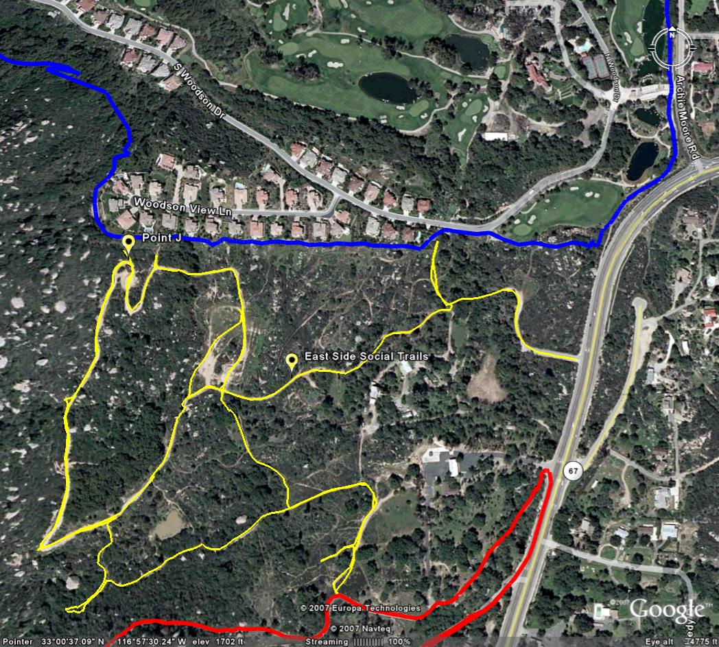 (Point H) or on Archie Moore Road (Point I) - At the entrance tot he CDF fire station pick up the wide dirt path under the trees heading south . This dirt path with soon come of out onto the paved service road that goes to the summit of Mt Woodson. Get to grunting and then grunt some more until you get to the summit. The service road continues past the summit and down to start of the Mt Woodson trail and Potato Chip rock. Take the Mount Woodson trail down the junction of the Fry Koegle trail (Point N). Turn right/north (and downhill) and enjoy the Fry Koegle all the way back to Archie Moore Road. Turn right onto Archie Moore road followed by another right onto side of Hwy 67 and roll back to your vehicle. 6 miles