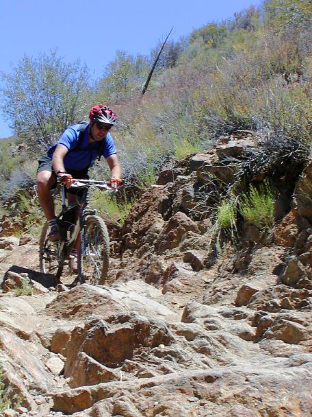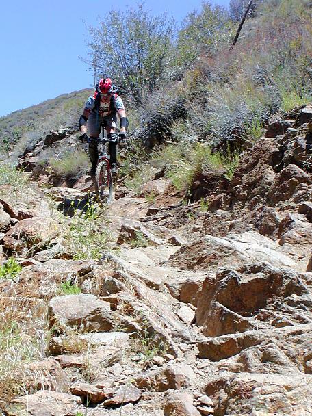 From this point down to the lower trailhead is known as "Extra Credit". After a short bit of climbing normally easy (may not seem so easy at this point in the ride) you get into some swoopy fun non-technical downhill singletrack. Enjoy it while it lasts as the trail will soon be back to jumbly rock sections that are often unrelenting. The rocks in this section are different that what you had to deal with further up the trail but they are no less treacherous. Speed and good "Monkey Motion" will help keep you out of the front wheel grabbers. The rocky technofest continues until just short of the trailhead. You have certainly earned a tasty beverage!