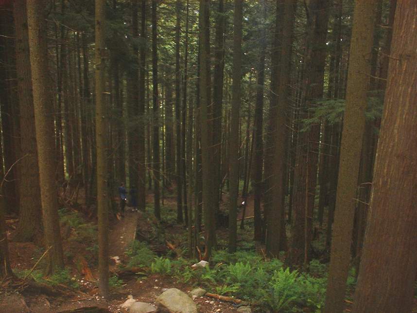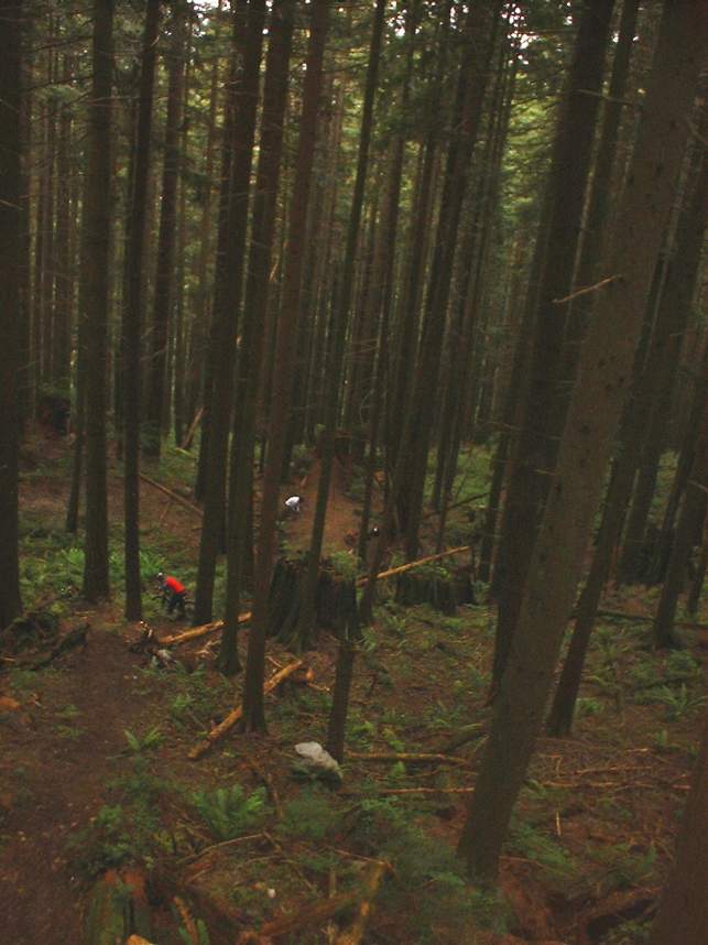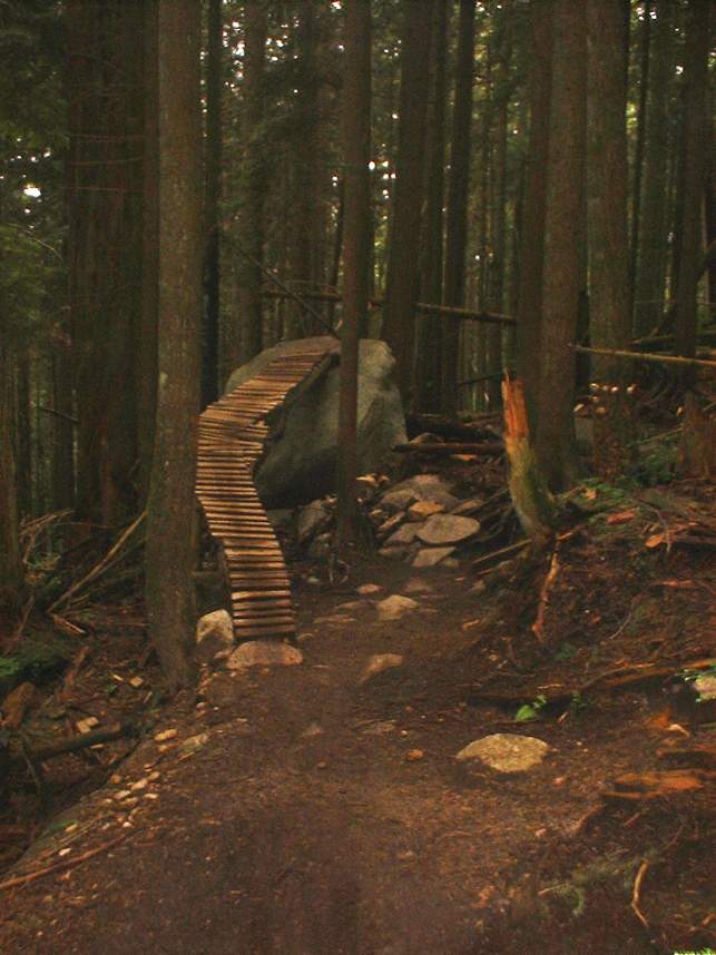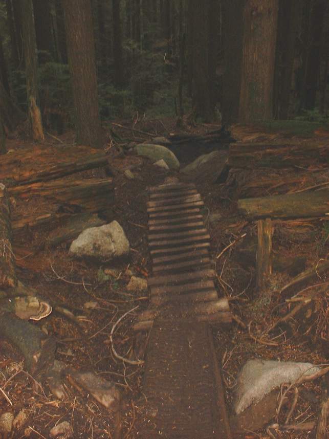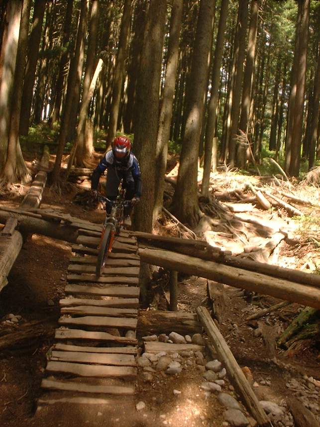 In June of 2003 I managed to get a couple of days of riding on the North Shore of Vancouver, BC. The first day was on Grouse Mountain and the second was on Seymour Mountain. The North Shore was more insane that I had expected. Some of the trails we did at Grouse Mountain where Seven Secrets, Krikem Krankem, Leopard, and Kirkwood. On the second day at Seymour we rode The Incline, Pangor, Slash, and Bridle Trails. These trails would be quite technical on a freeride bike, and where down right challenging on my cross country rig. The riding here was quite fun and exceptionally challenging with much different terrain and technical obstacles than we typically see here in Southern California. I highly recommend you bring along some plastic courage (protective gear) with you. You will be more likely to try the new stuff. Don't worry about sticking out, everyone I saw on the trail decked out in the stuff.
