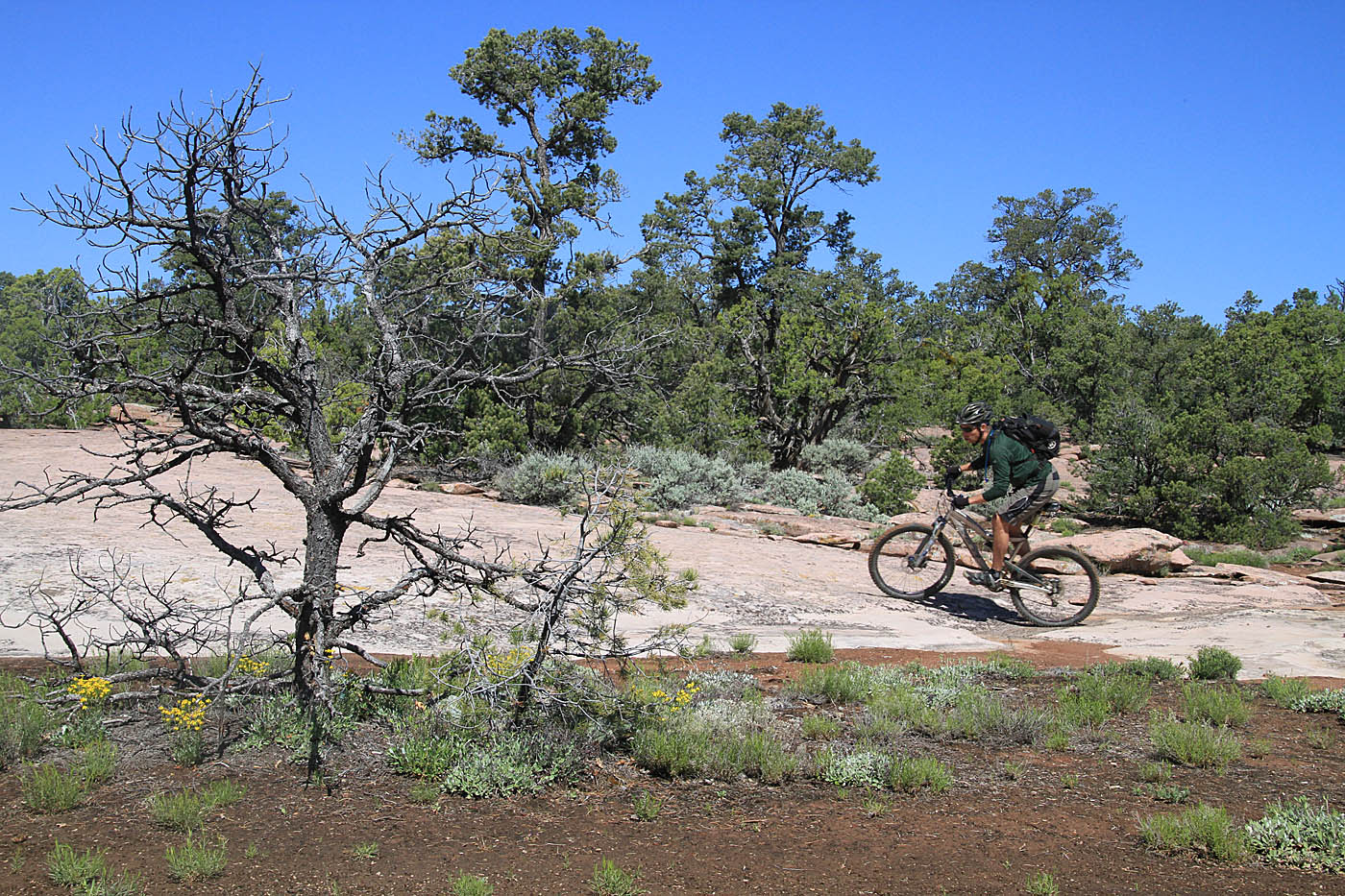 Besides the great views and tight singletracks, I really enjoyed the investigating mindset you have to stay in while out on the slickrock. The route finding here varies from interesting to downright difficult. There are plenty of options for free-forming lines on the rock. Before you do that, take a look around and make sure you stay off the untrammeled cryptobiotic soils. The are a vital part of the ecosystem here and one bike track or footprint on this stuff can take a hundred years or more to recover. There are only about a million awesome lines out here to chose from that will not mess with the fragile soils here, so please pick one of them.