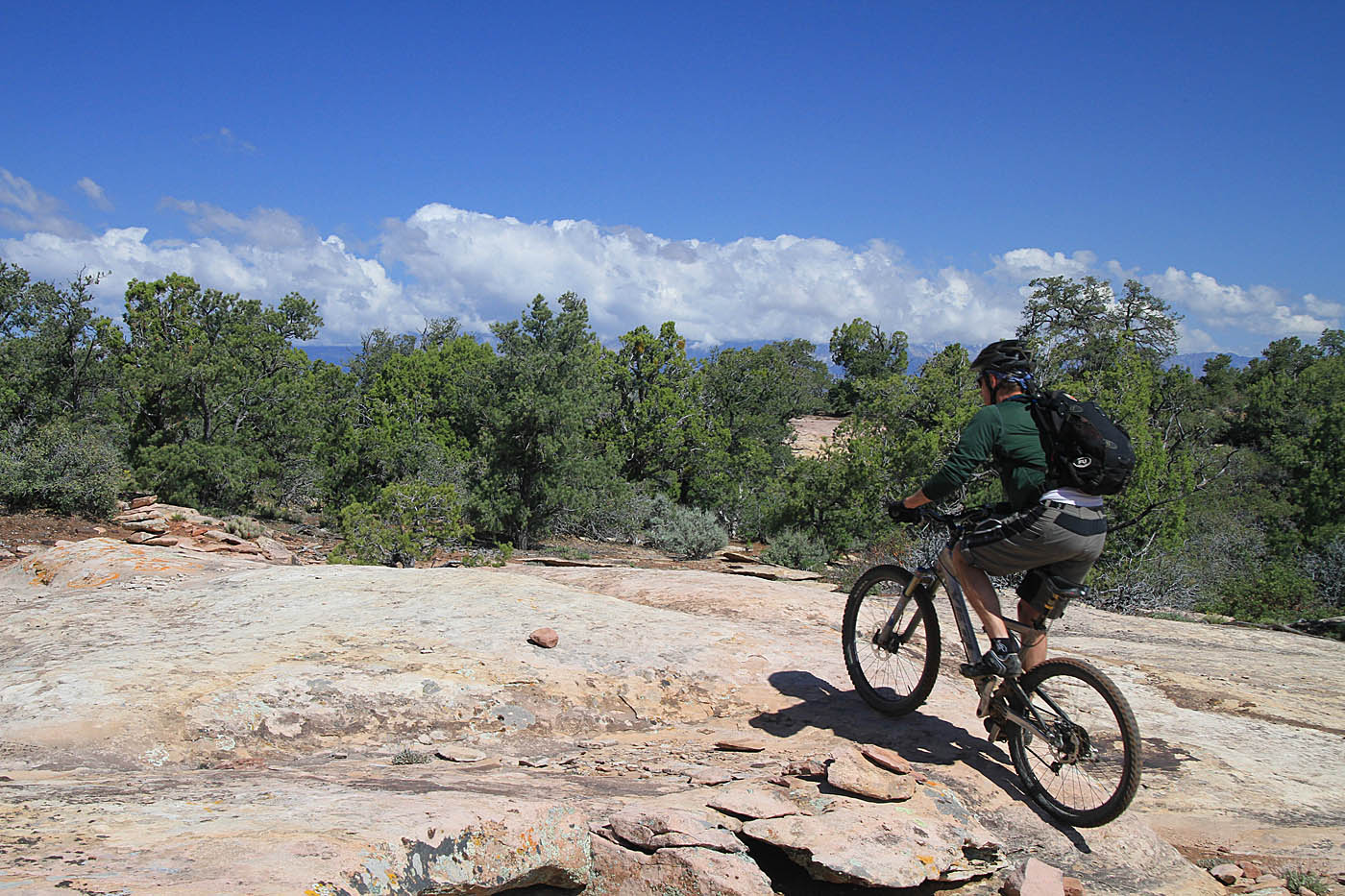 Shortly (0.2 miles) after rolling down a bit of doubletrack from the trailhead we hung a right onto a bit of forest singletrack marked by a set of stacked rock cairns. Get used to looking for these as they are pretty important for finding you way around here. It was not long before we came out onto an expansive field of slickrock. There are cairns to be seen both to your left and right. Our intention was to do a big loop from here and retrace our way back up the singletrack we just came in on later in the day. We took off to the left and enjoyed a great mix of both forested singletrack and sections of slickrock.