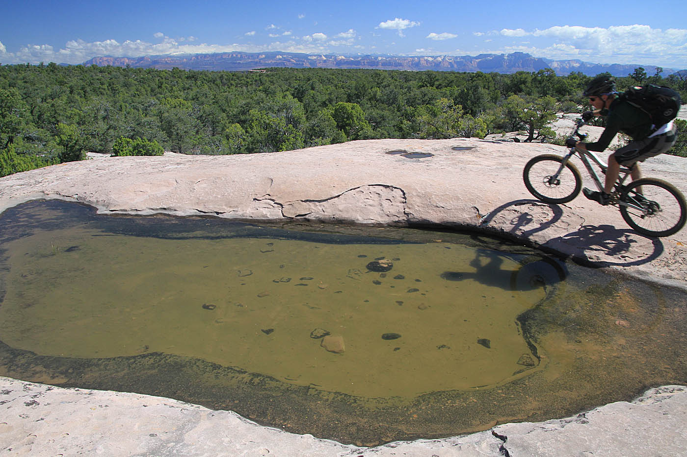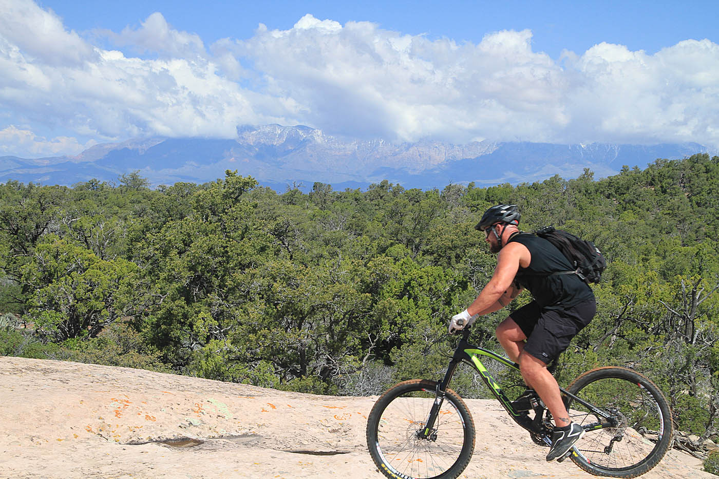 Little Creek Mesa is a real hoot for those who love great techish singletrack, playing on slick rock, incredible views and have a since of adventure. While located only about 15 miles outside of Hurricane Utah (as a crow flys), it will take you about an hour to get there from town. The slickrock with drops, ledges and rollers coupled with twisty forested singletracks that often run along the rim of the mesa are a real treat. You will need to have good navigational skills as the trail are marked only with rock cairns that are not always easily spotted. Danger awaits the overzealous who freeform on the rocks without snooping around first. There is little in the way of serious elevation change here, but there are lots of short and strenuous sections. If you have not done Gooseberry Mesa before, I recommended you you get in a ride there first. Gooseberry is pretty well marked and it will help develop your navigational senses on this type of terrain that will make your experience at Little Creek Mesa much more enjoyable.
