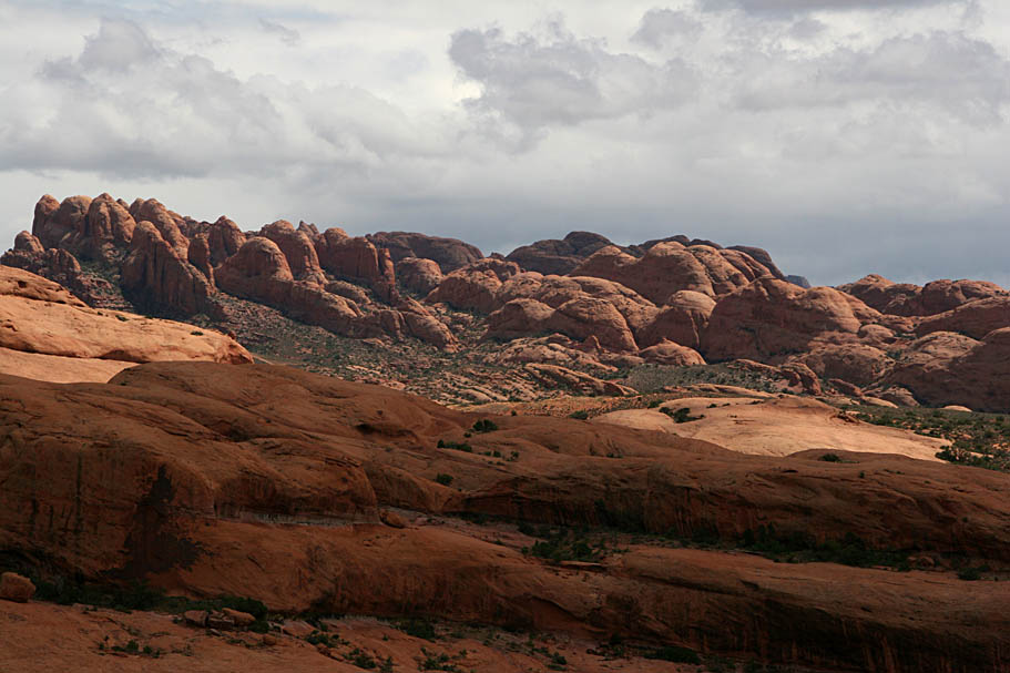 Somewhere around the 8 mile mark you come to a T-intersection with the domes behind your right shoulder around the 4 or 5 o'clock position. We ran into a couple of Canadian gals who followed the loop in the clockwise direction and from their description it sounded like the counter-clockwise direction is certainly the way to go. We hung a right here and did a rocky climb for about half mile up to the rim where we were treated to some great views of the Moab Valley.