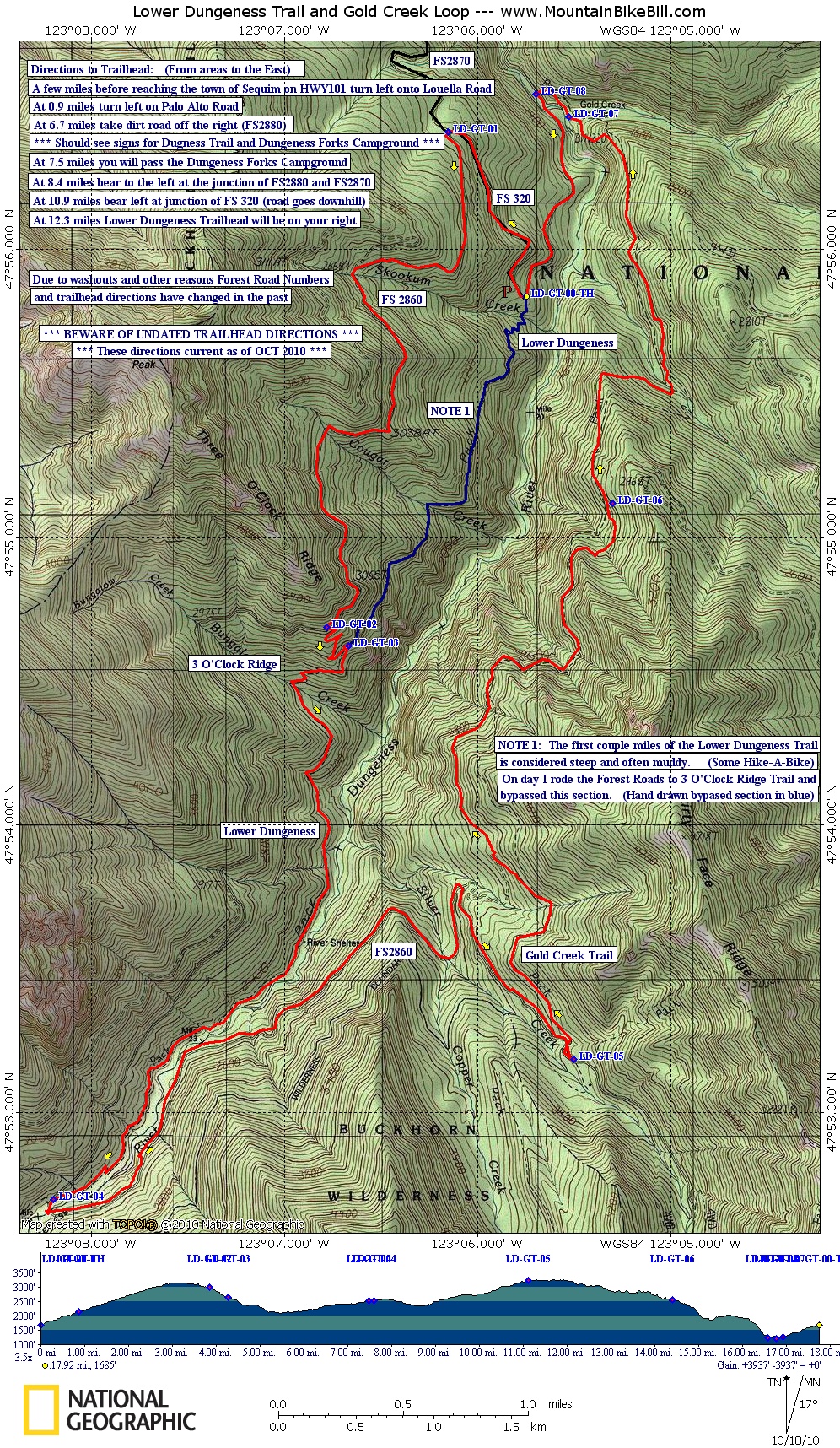Located on the the eastern slopes of of the Olympic Peninsula in the Olympic National Forest this loop should impress even the most discerning singletrack connoisseurs. The route is comprised of the Lower Dungeness trail and the Gold Creek trail with some forest road riding used to connect the two. Narrow singletrack abounds on this 18 mile route that varies from meandering between old growth forest along the picturesque Dungeness River to clinging to the side of steep hillsides as you cash out 2,000 feet of elevation on the Gold Creek trail. I did this route and a cloudy and foggy day that had an ethereal feeling in the air that added a special something to this ride that I can only meagerly describe as "Chicken Soup for The MTB Soul".
