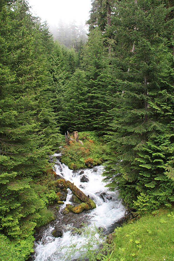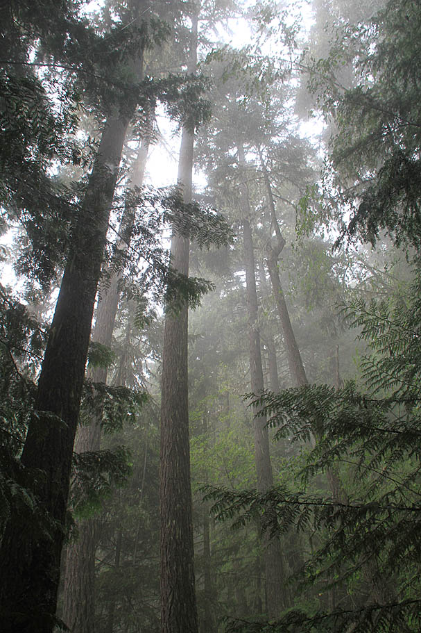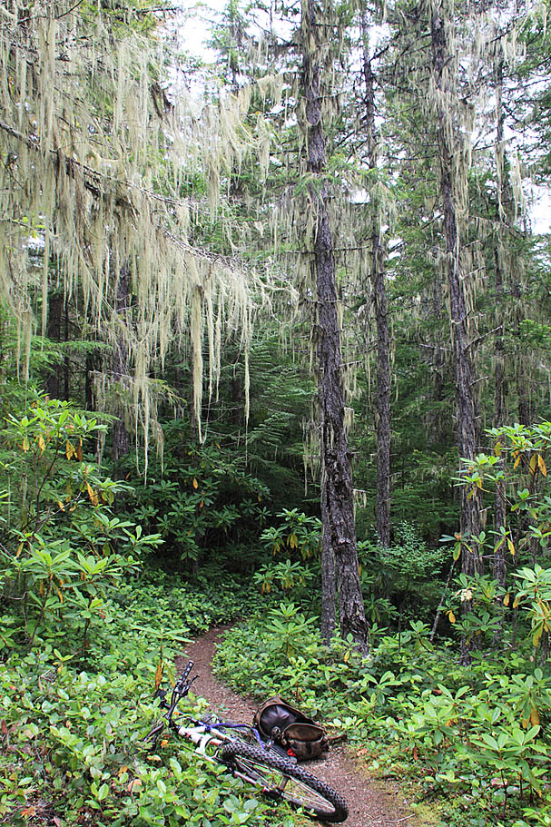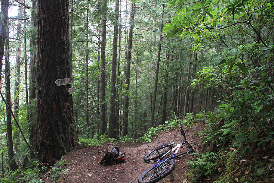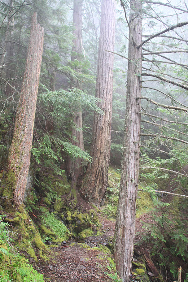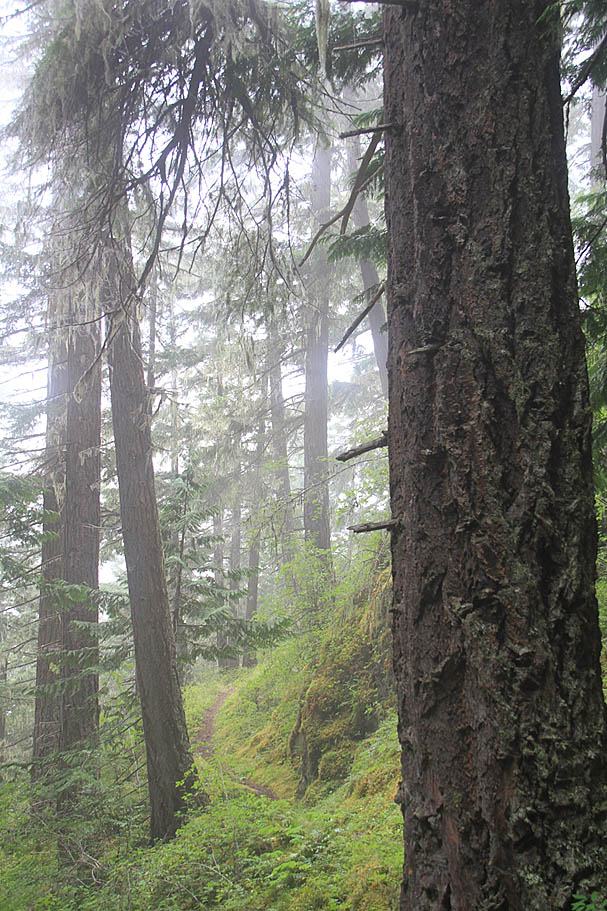 Be ready for some seriously incredible singletrack. The Gold Creek trail is one of the most narrow and buff bench cut singletracks I have had the pleasure to ride. The first 3/4ths of a miles is a fairly level transverse before you start shedding off elevation. I thought the clouds were going to break for a short while, but they merely thinned before settling back into a pretty thick sound that gave the trail an ethereal and sometimes spooky feel about it. I have a bear bell (back in SoCal) that I sometimes put on my bike when I am riding select trails in Southern California where I want people to know I'm coming. This was my first time riding when I really wanted a bear bell to be used for it's as-built purpose. Before I knew it I found myself whistling and making noises just to make sure that I would not come around a corner and surprise anything further up the food-chain than myself. There was one moment when I was taking pictures that I got a distinct feeling that I was being watched. Wither it was just head games or not I will not know, but I was not going to gamble that maybe some long unused protective senses was at work here for my benefit. I got back to riding sweet singletrack and left the "Willies" back up the trail.