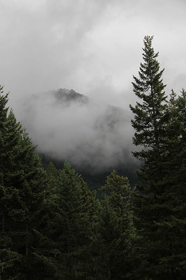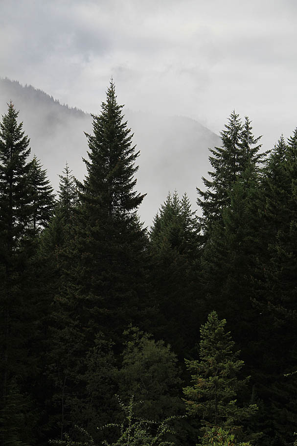 Once down close by the river the trail twisted and weaved around impressive trees. The place had a rainforest type feel to it with a thick blanket of pillow thick moss covering just about everything on the ground but the trail. While I saw peeks of the river the noise of it was quite impressive. At around the 6 mile mark(overall) the trail takes you by a River Shelter. You can find these on various trails in Washington and while I have not read up on their official use, I'm sure it is something related to public safety and the finicky and often tough weather of the Pacific Northwest. From this point on the trail gains elevation as it bobs and weaves alongside the river. Everywhere I looked there were Kodak moments going by. It was not the long scenery that you get in places like Poison Spider Mesa or the Rainbow Rim Trail, but instead it was this glorious short scenery that was only enhanced by the fog and clouds.